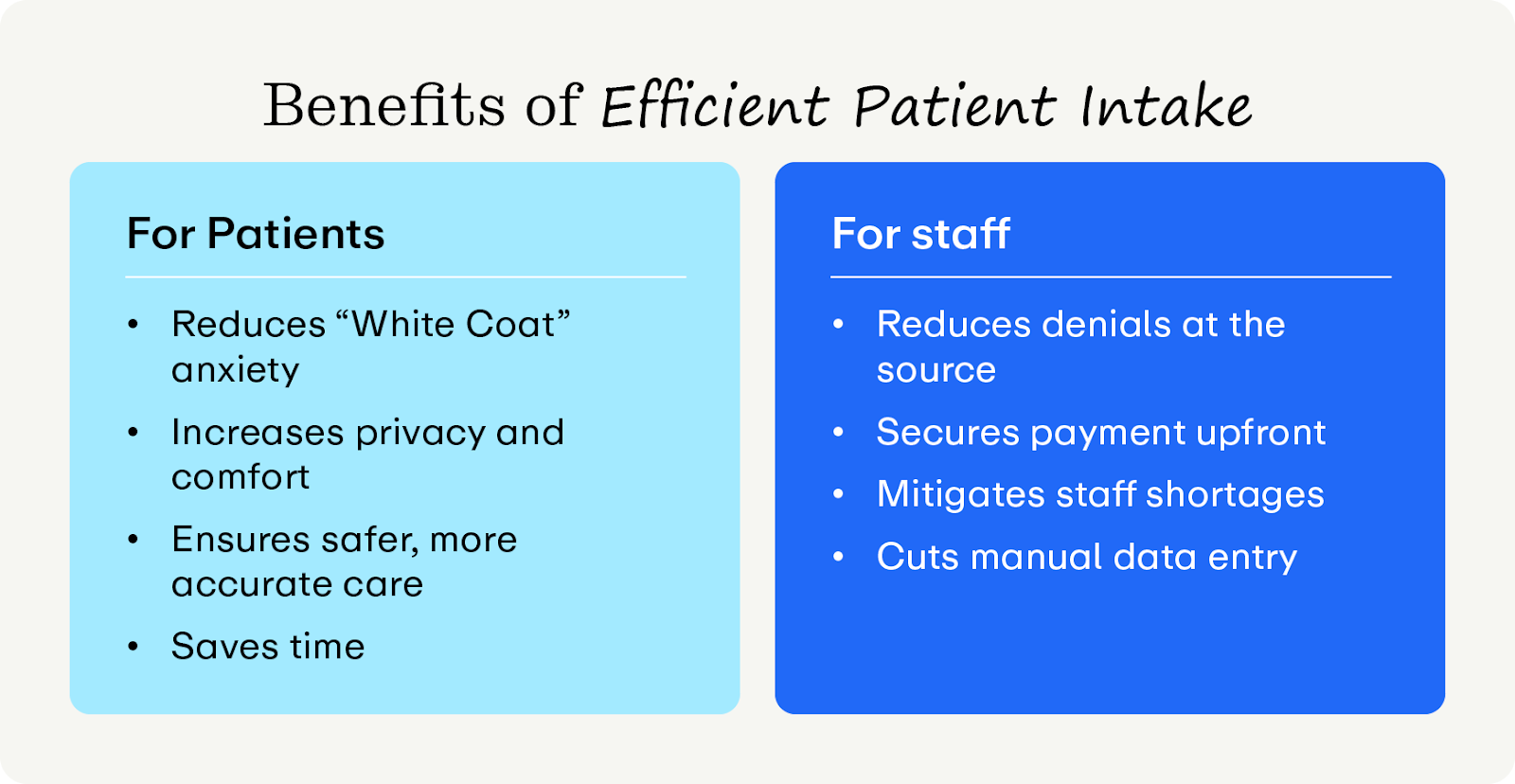 - Stops insurance denials at the source: Registration and eligibility errors account for roughly 24% of all claim denials. Efficient intake validates insurance coverage before the patient arrives, preventing costly retroactive rejections.
